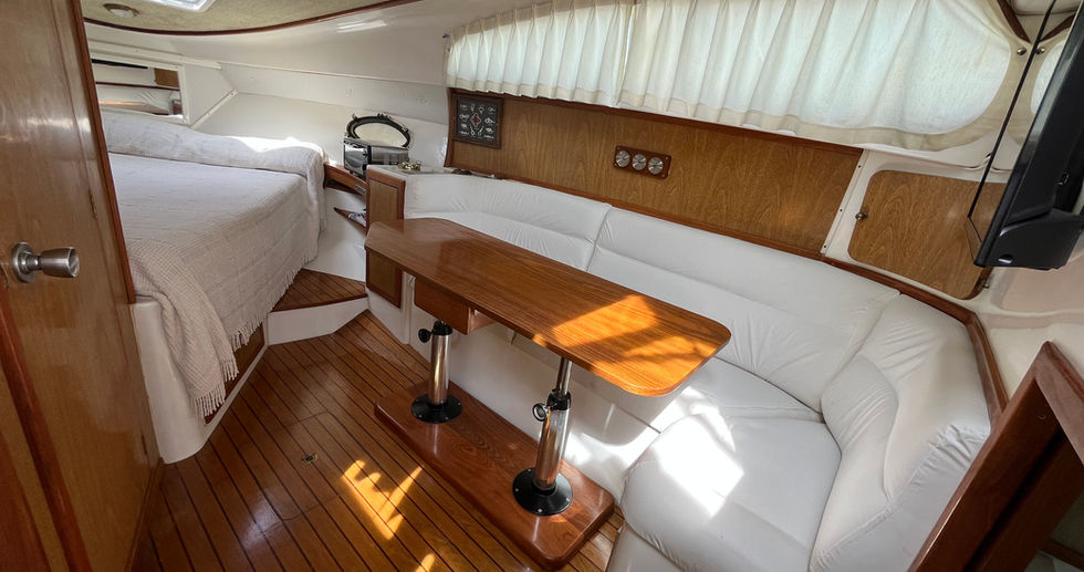 CAMA EN PROA, CONEJERA, 1 BAÑO, SILLON EN U CON MESA REGULABLE, COCINA ENFRENTADA