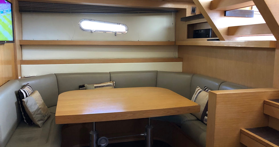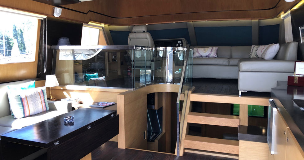 Cómodo Acceso al cockpit. Amplia área de asientos en L con mesa y sillón enfrentado a la altura del puesto de mando.